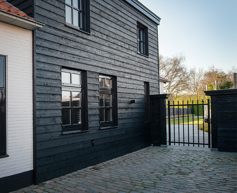 • Zwart gespoten (2x), dieper zwart en blijft langer zwart dan gedompelde planken